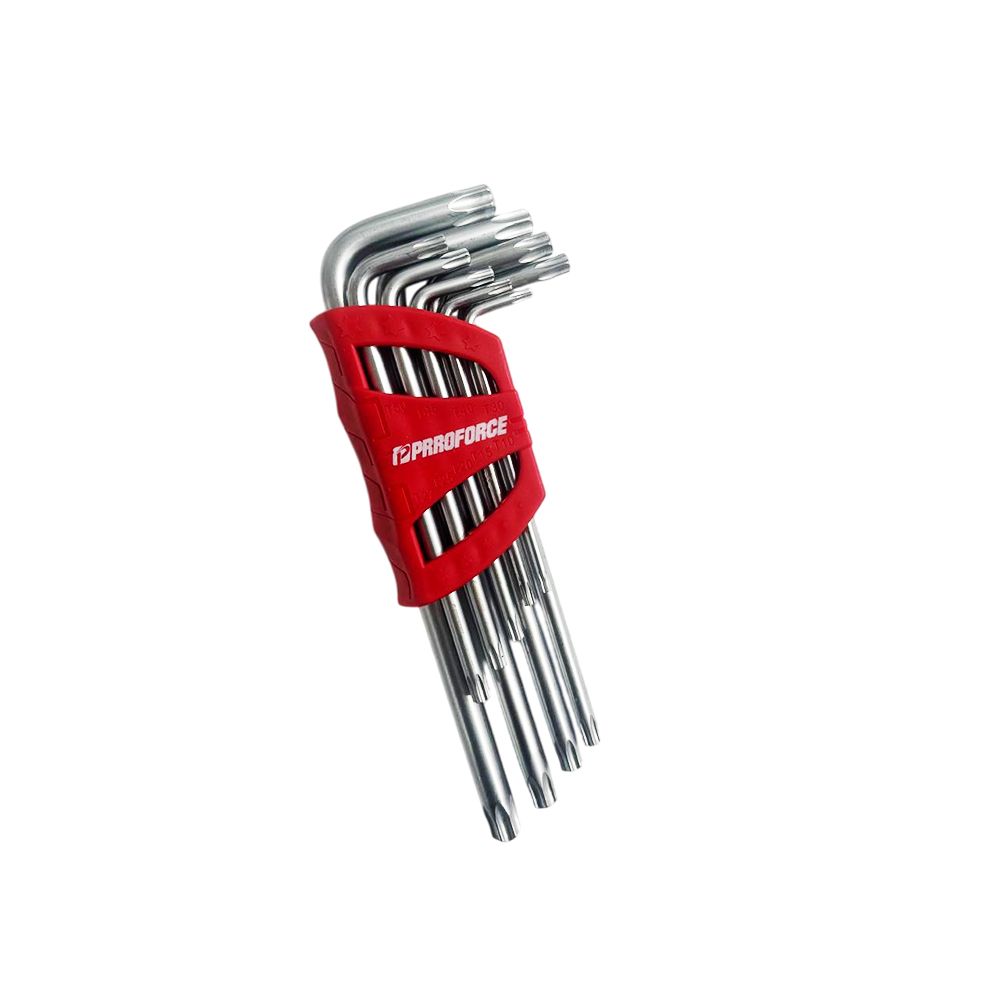 PPRROFORCE աստղաձև վեցանկյուն բանալիների հավաքածուն (9 կտոր) հուսալի գործիք է TORX տեսակի վինտերի և բոլտերի հետ աշխատելու համար։ Պատրաստված է կարծրացված պողպատից, որը ապահովում է ամրություն և երկար ծառայություն։ Հարմարավետ պահոցը թույլ է տալիս հեշտությամբ պահել և արագ գտնել անհրաժեշտ չափսը։ Իդեալական է ավտոսերվիսի, տեխնիկայի վերանորոգման, կահույքի հավաքման և կենցաղային աշխատանքների համար։